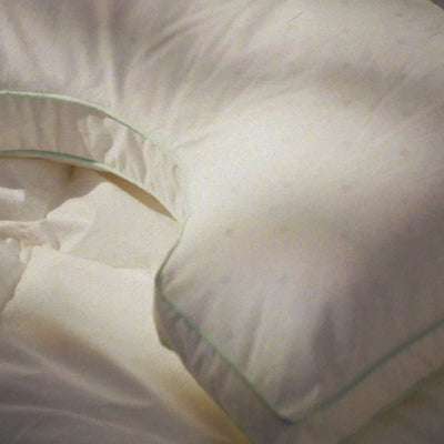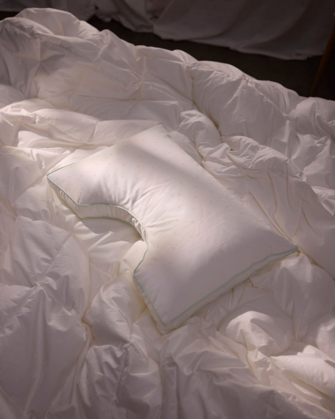 Pudens buede form er designet til at omfavne nakke og hoved, så du ligger naturligt, uanset om du sover på siden eller ryggen. Den vinklede kant giver plads til skuldrene og hjælper dig med at holde en afbalanceret stilling hele natten.